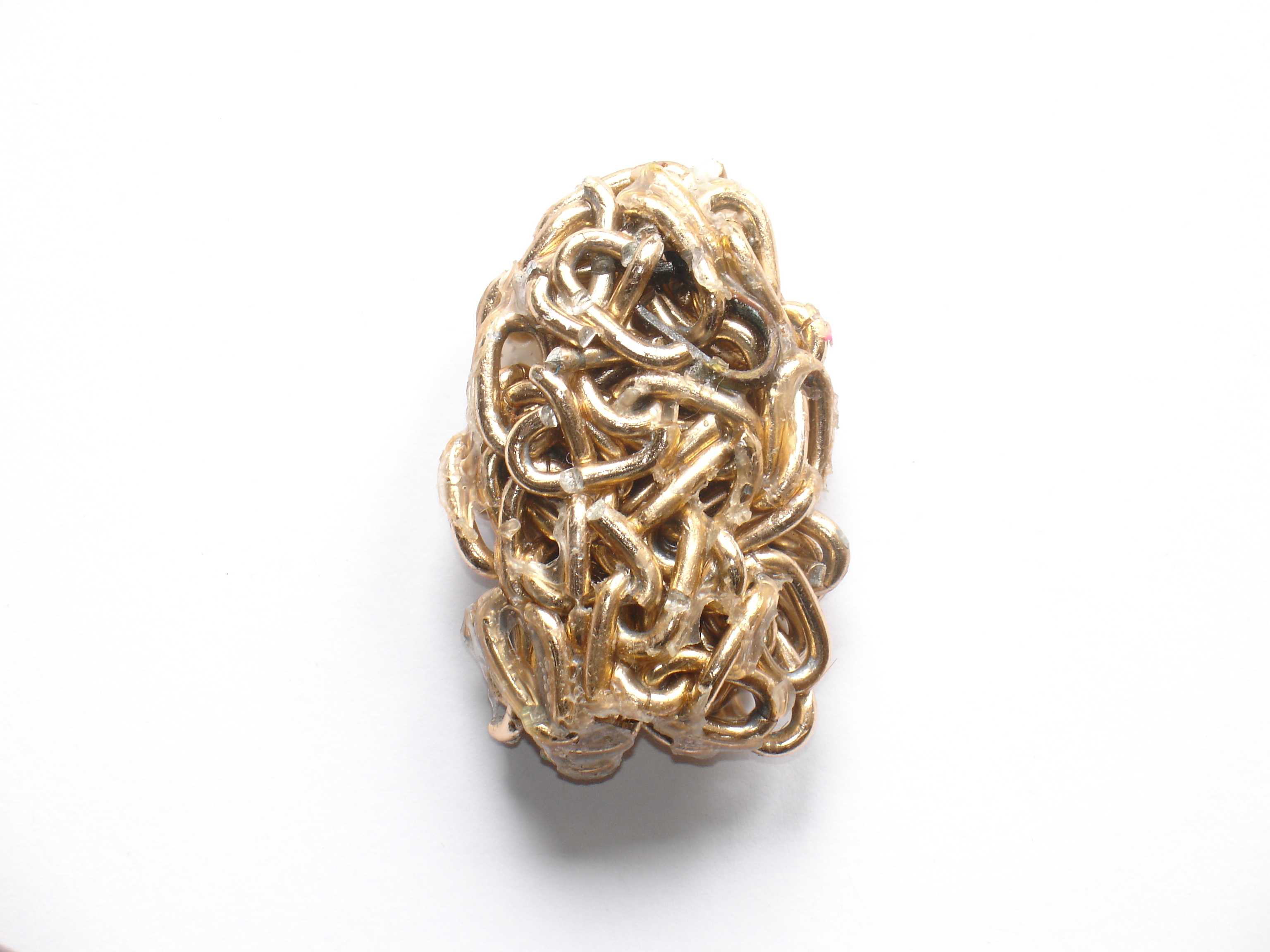 Cette madeleine est faite avec une chaîne en plastique dorée, très kitch. D'ailleurs, elle était si laide, qu'au moment où je l'ai trouvé par terre, elle m'a, pour ainsi dire, obligée à la ramasser. Mais finalement, quand je l'ai tenu au creux de ma main, je me suis demandé à quoi était enchaîné le premier anneau ?