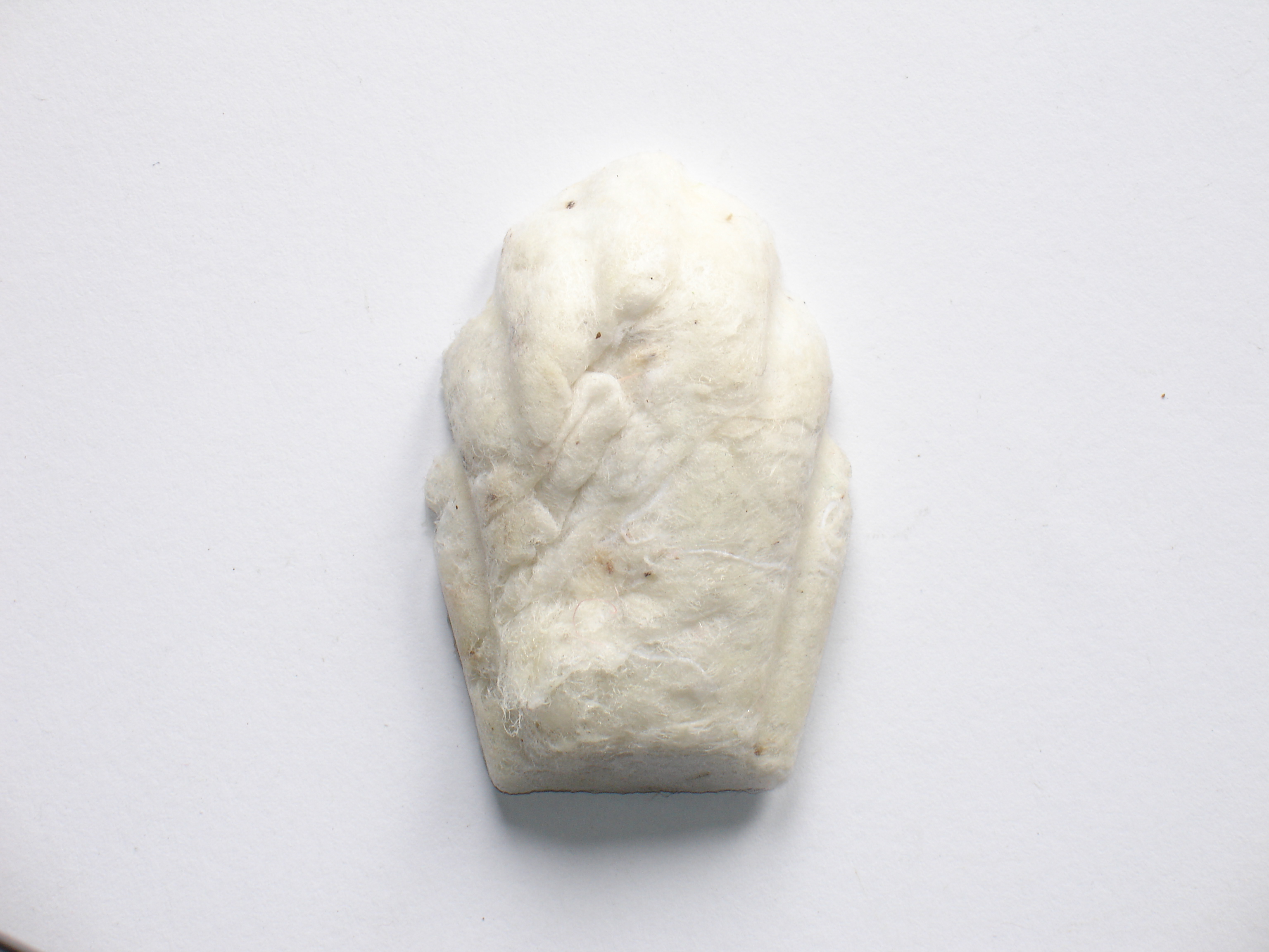 C'est de la OUATE. Une amie qui travaille beaucoup avec ce matériau, me l'a donné après une exposition qu'on avait faite ensemble. Il y a vraiment une attirance de peau à peau avec cette madeleine. Quand je l'effleure je sens ce petit nuage, dont les poumons ont respiré trop fort l'éther.